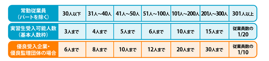 ひとつの企業様が1年間に受け入れ可能な人数は、常勤従業員数によって定められています。