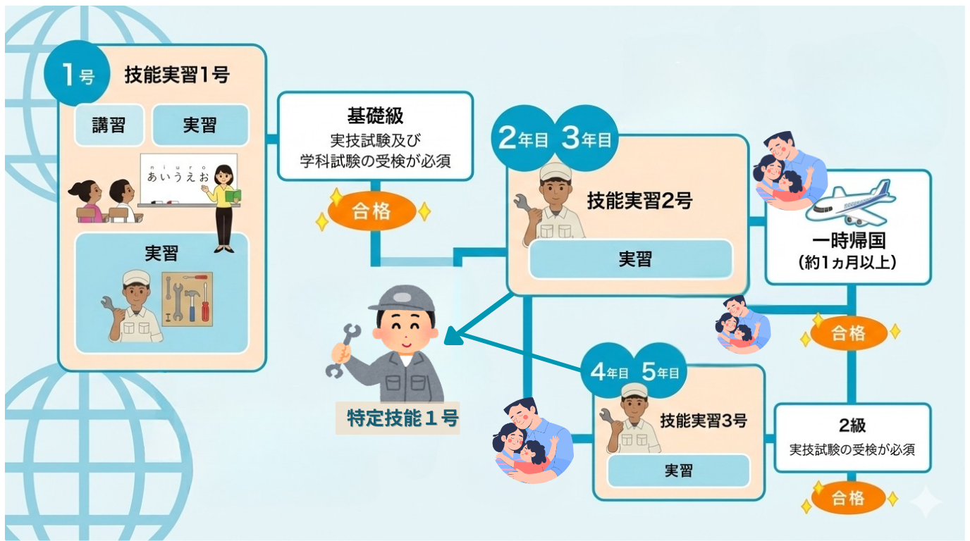 技能実習2号(2〜3年目): 基礎級合格後、さらに2年間の実技習得。